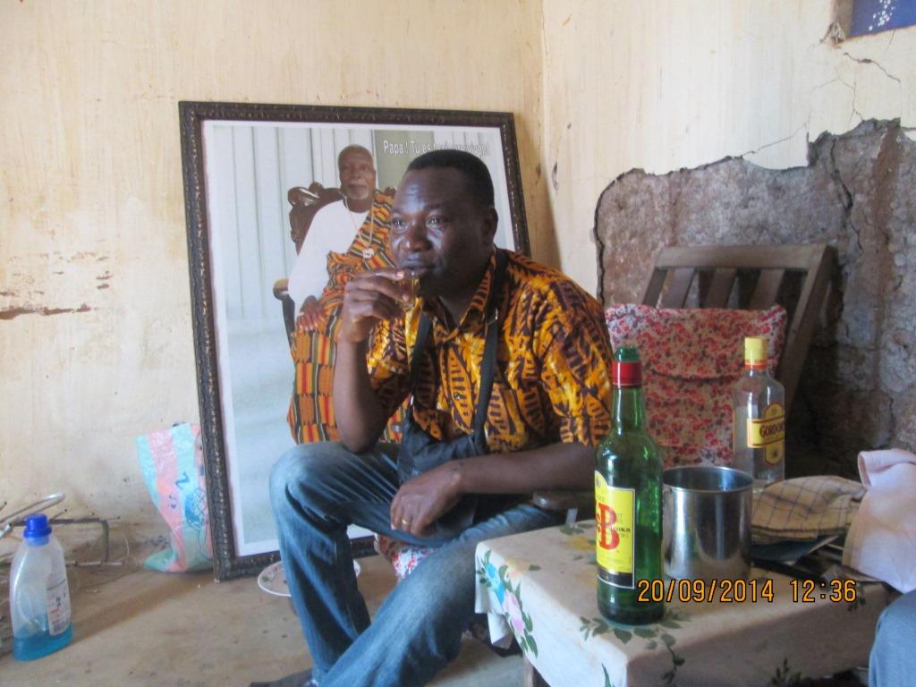 Justin Mondenou Togbossi_l’homme qui au volant de sa voiture, rencontra le bélier ressuscité_est le fils de l’ancien régent du trône de Glidji. (Eh oui, j’ai des relations haut placées là-bas). Il nous (Pascal et moi) convie à faire un tour dans la maison de son père ancien dignitaire du trône ; aujourd’hui décédé. En entrant dans la première cour de la maison, nous tombons encore sur des tam-tams. Pour taquiner Justin, je lui demandai rapidement : « Où est le bélier ? Vous avez-vous aussi un bélier à zigouiller et à ressusciter » ? (je suis infernal, je sais). Il se permit de sourire. En approchant du milieu de la cour, où sont installés là encore des hommes en blanc, coiffé d’un couvre-chef blanc, signe distinctif me dit-on des prêtres vaudou, nous entendîmes le tam-tam retentir. Les prêtres nous souhaitaient la bienvenue. Justin dirige la marche. Nous le suivons à pas respectable. Il s’approche d’une calebasse remplie d’eau et d’herbes, posée à même le sol, devant les percussions. Celles-ci continuaient de résonner. Justin laisse tomber dans la calebasse eau et herbe, quelques pièces de monnaie. En profane, nous demandâmes si nous pouvions faire pareil. Il acquiesça. Quand je m’approchai de la calebasse, le rythme changea. Comme si le percussionniste jouait un son différent en ma présence… Etant sûr de ne pas être mort depuis ce matin-là, je n’avais pas peur de me revoir ressuscité! Je laissai tomber une pièce (modeste fortune…). Pascal fit de même, et là encore, en sa présence face à la calebasse, le rythme changea! Les prêtres nous invitèrent à passer au salon et à nous faire servir de l’alcool et du Yèkè-yèkè. Ils prononcèrent à l’endroit de Mondenou un bref discours l’autorisant à se servir comme il pouvait. Notre ami est le dernier né de la famille. Tout pouvait lui appartenir; il avait le droit sur tout ce qu’il voulait, ainsi que le veut la tradition.